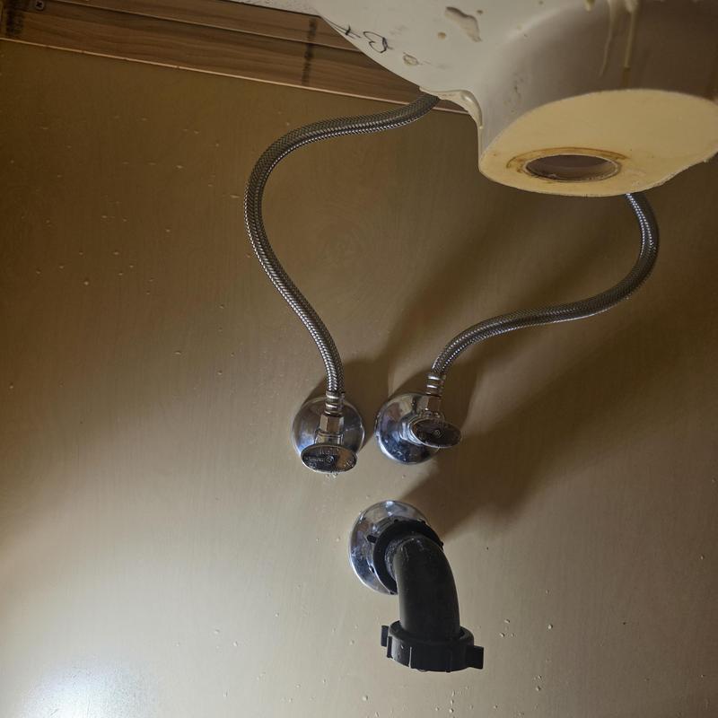 A plumber in San Tan Valley, Arizona replaced failed plastic angle stops and supply lines on a lavatory faucet. The parts had leaked inside a cabinet, requiring an emergency service call to prevent further water damage.