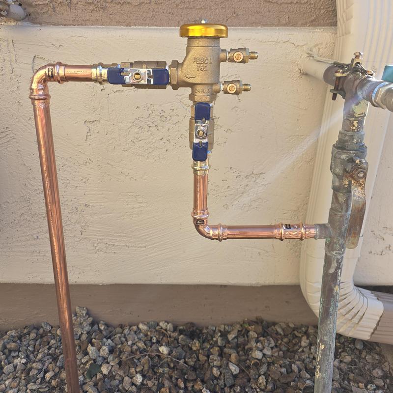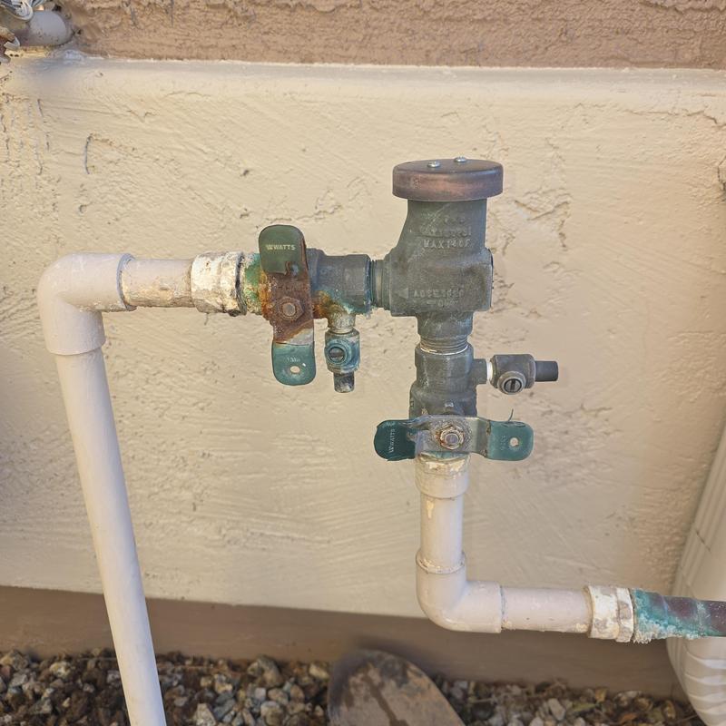 A plumber in Queen Creek, Arizona replaced a pressure vacuum breaker on a landscaping water supply. The contractor removed all PVC piping and installed copper piping to increase durability.